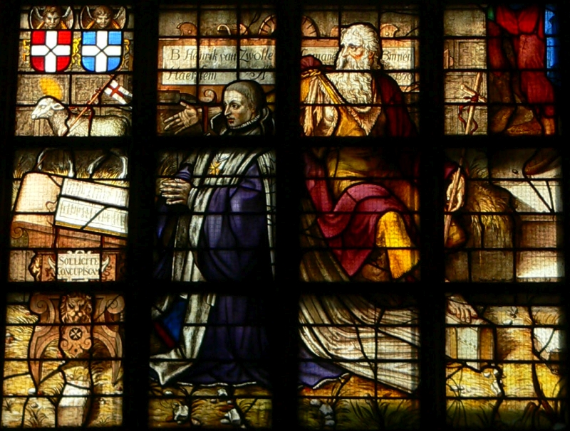 Onder in het glas is de schenker, Hendrik van Zwolle, commandeur van de Johanniterorde te Haarlem, afgebeeld met daarachter Johannes de Doper. Van Zwolle werd in 1542 benoemd tot coadjutor van de Johanniter Orde in Haarlem. Twee jaar later werd hij benoemd tot commandeur. In 1571 legde hij zijn functie als commandeur neer vanwege zijn hoge leeftijd. Hij is al het tweede lid van deze orde die een glas aan de Sint Janskerk van Gouda schenkt. Omdat deze orde ook als patroonheilige Johannes de Doper heeft zijn prominente leden waarschijnlijk makkelijker te porren geweest voor een schenking.
