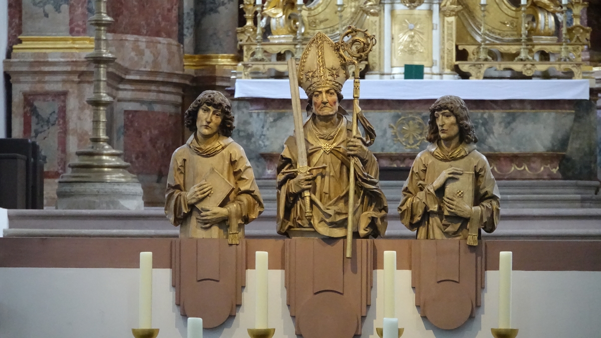 De Ierse missionaris Kilian bracht het christelijk geloof naar Franken en stierf rond 689 de marteldood met zijn metgezellen Kolonat en Totnan. In de kathedraal zie je een afbeelding van dit driemanschap.