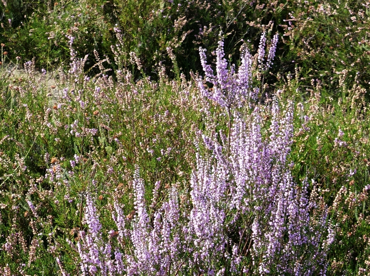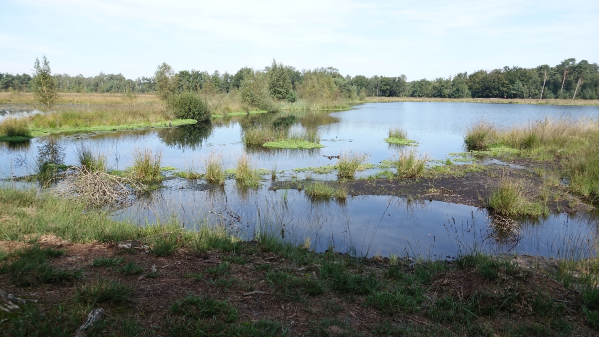 Twee jaar geleden rond deze tijd waren we ook in dit gebied van Natuurmonumenten: de Kampina Heide. Nu waren we in een iets ander deel, het gebied van de Huisvennen. Dit zijn vennetjes die zijn ontstaan op plekken waar turf was gestoken. We liepen een route die hier helemaal doorheen liep, en daarna volgde onze route het riviertje de AA dat vroeger diende om de turf naar Boxtel en Den Bosch te vervoeren. We zagen uitgestrekte velden met heide maar de meeste heide was al uitgebloeid. Er waren nog maar enkele mooie stukjes struikheide. De veel minder voorkomende dopheide was ook al bijna uitgebloeid. Het lijkt er op dit moment op dat het wel nog twee weken heel mooi weer gaat blijven met veel zon. Heel veel rode bramen deden hun best om in die tijd misschien alsnog rijp te worden. Ook zagen we Gagel, de struik die zo lekker ruikt, vooral als je de bladeren tussen je vingers wrijft.