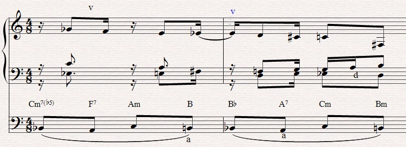 Ik heb twee maten waar dit thema in het pedaal zit geanalyseerd: ik heb er akkoordsymbolen bijgezet en aangegeven waar er dissonanten als voorhouding (v), anticipatie (a) en doorgangsnoten voorkomen. In de toplijn klinkt dalende chromatiek, maar zodanig geharmoniseerd, samen met het Bach-thema in de bas, dat er duidelijke akkoorden klinken. Deze akkoorden lijken nauwelijks samenhang te hebben, waardoor de toonsoort gaat zweven.