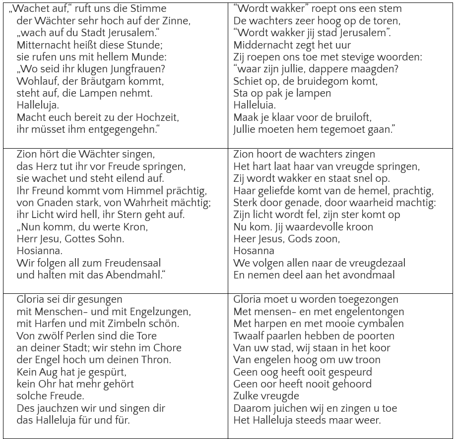Het is vandaag 8 december 2023. Afgelopen zondag was het de eerste zondag van de advent: de periode waarin de Christenen vol verlangen uitzien naar Kerstmis, de geboorte van Jezus. De laatste zondag daarvoor wordt ook wel Eeuwigheidszondag genoemd. Dat is een dag in het kerkelijk jaar die vooral bij de protestanten wordt gevierd. De doden van de kerkelijke gemeente worden dan herdacht. Het is een dag die je kunt vergelijken met 2 november in de katholieke kerk: Allerzielen. Bij deze dag hoort een kerklied uit 1599 van Nicolai: Wachet auf, ruft uns die Stimme. De melodie van dat kerklied is gebaseerd op een bekend deuntje van de Neurenbergse schoenmaker en meesterzanger Hans Sachs, maar heeft er inhoudelijk niets mee te maken. Het kerklied heeft deze tekst en melodie: