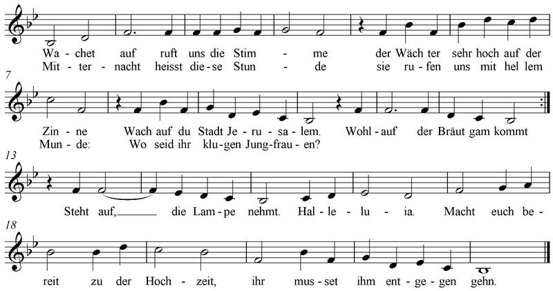De beginnoten van de melodie – een stijgende gebroken grote drieklank met even later een sext – staan oorspronkelijk voor het aankondigende signaal van de poortwachters. Zij waarschuwen de geliefden om niet door te slapen tot de ochtend aanbreekt nadat ze samen de nacht hebben doorgebracht. Maar de tekst krijgt een nieuwe betekenis. Het signaal van de wachters kondigt de komst van de verlosser aan. “Zion” is een personificatie van “Jerusalem”. De maagden zijn waarschijnlijk een verwijzing naar de tien maagden uit het evangelie van die dag. Op diezelfde zondag wordt namelijk ook de parabel van de vijf dwaze en de vijf wijze maagden gelezen. (Mattheüs 25:1-13. ) We lezen daar: