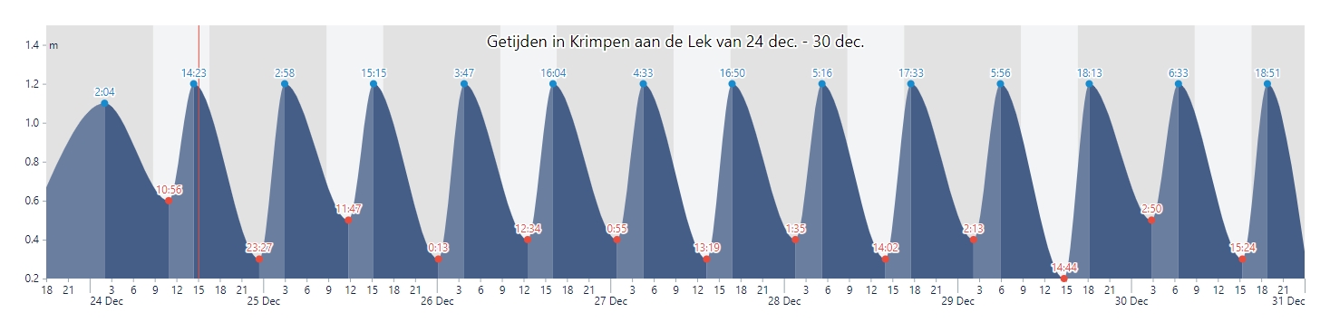 Je ziet dat de tijden van hoog water elke dag 40 tot 50 minuten naar achteren opschuiven: vandaag was het vloed om 14:23 uur, morgen om 15:15 uur. (Daar tussen in, in de nacht, heb je trouwens ook nog een keer hoog water). Wil je waar ik woon het water op zijn hoogste punt zien, dan moet je vooral letten op de tijden dat het vloed wordt.