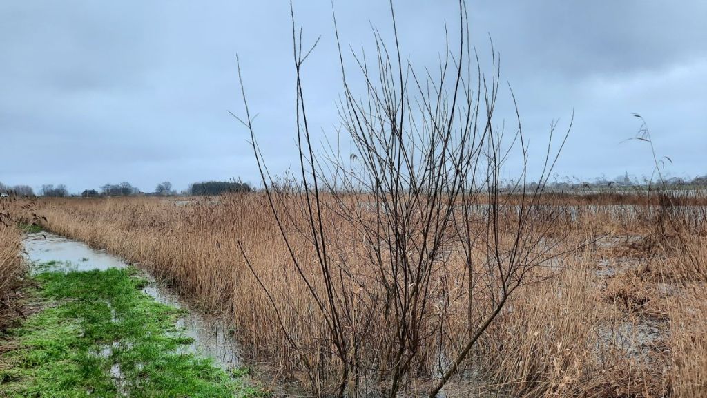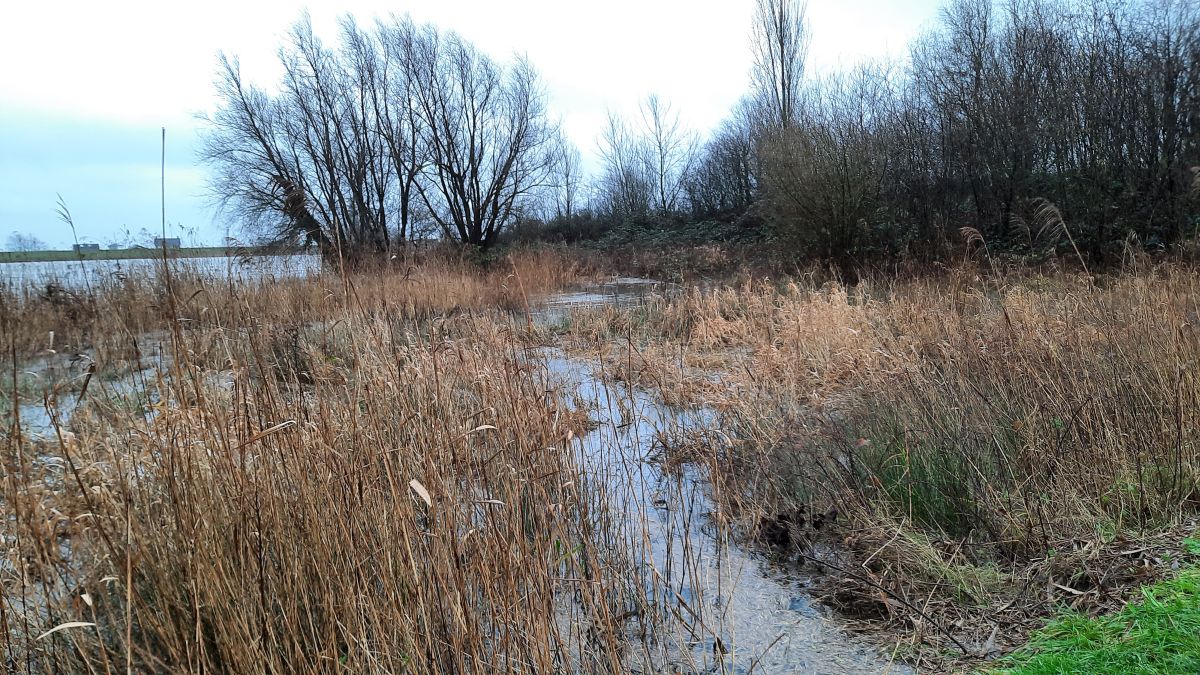 Hier staan normaal riet, droog gras en kruiden, Een eindje voorbij de bomen stroomt de Lek