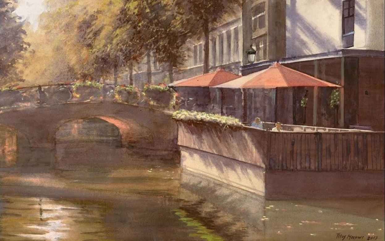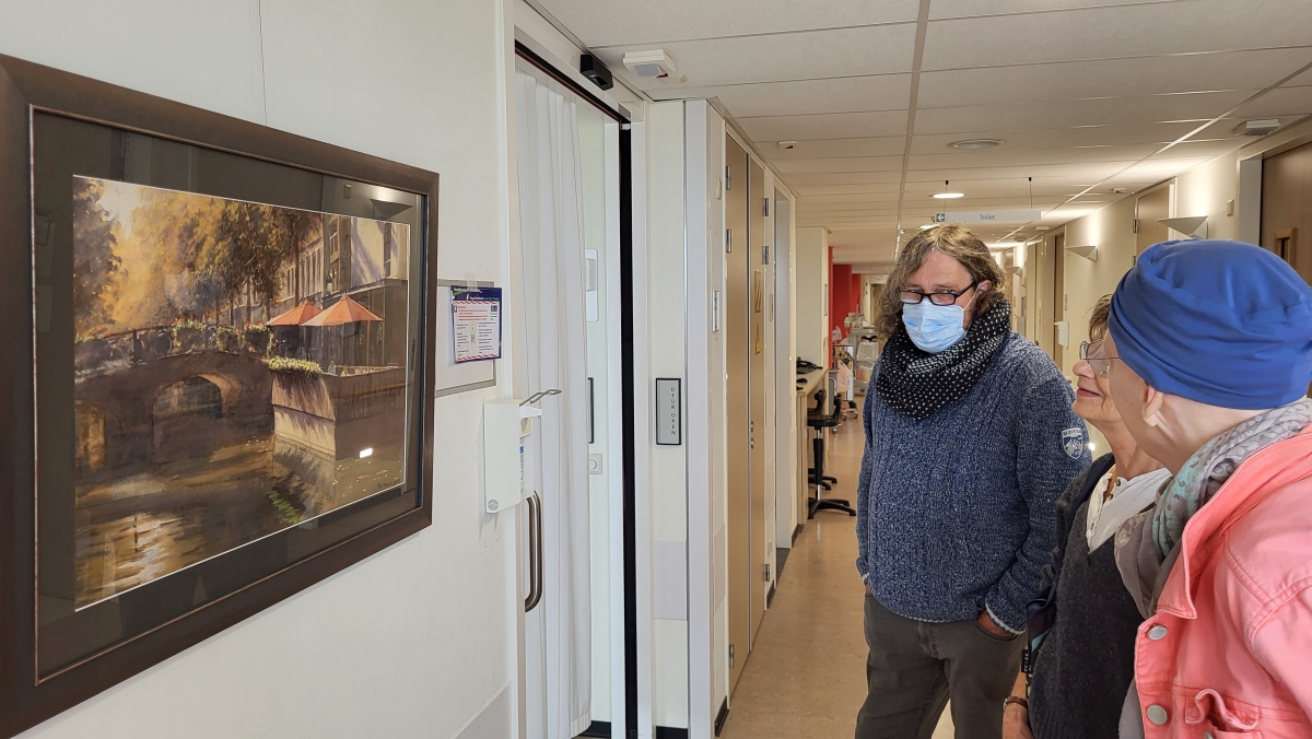 In den Haag is er een eetcafé met de naam Hathor. Café Hathor is een echt begrip in de Haagsche kringen. Het is een gezellig bruin café waarvan het terras en de terrasboot aan de Maliegracht direct in het oog springen. De Maliegracht is een deel van de gracht dat uitkomt op het Smidswater. Titus Meeuws, de kunstenaar die zijn atelier in Den Haag heeft en zijn galerie in Schoonhoven, heeft een mooi schilderij gemaakt van café Hathor. Mijn vrouw herkende het omdat zij er wel eens met haar zus gezeten heeft, aan dat mooie terras. Toen ze zes weken was opgenomen in het Haga ziekenhuis zag ze daar enkele schilderijen die er goed tot hun recht kwamen. De patiënten op de afdeling Hematologie waar ook zij lag konden binnen hun beperkte bewegingsruimte over de gangen lopen waar die schilderijen hingen. Even was het kantje boord met de gezondheid van mijn vrouw maar dankzij de zeer bijzondere en kordate aanpak van het team en vooral ook van de verpleging kwam ze er boven op. Idee! Zou het geen goed idee als dat schilderij van Titus Meeuws daar zou hangen! Het was een plek waar je even kon zitten, alleen of met iemand die bij je op bezoek was. Het afdelingshoofd vond het een mooi plan en inmiddels hangt het gekozen schilderij op deze prachtige plek. Als je Den Haag kent, en op de bewuste afdeling wordt verpleegd, kun je denken aan de tijd dat je in de toekomst wellicht weer een keer aan dat prachtige terras kunt zitten.